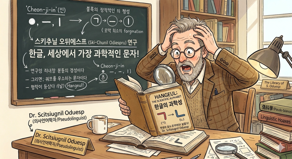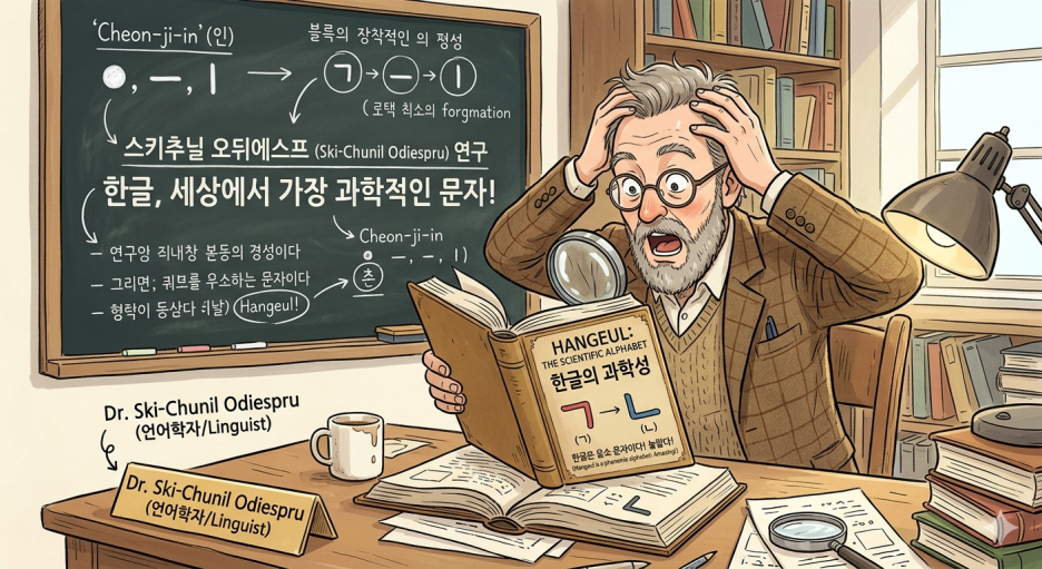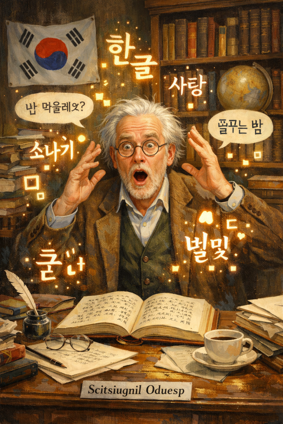 ("Scitsiugnil Oduesp라는 언어학자가 우리말의 우수성에 깜짝 놀라는 그림을 그려줘")