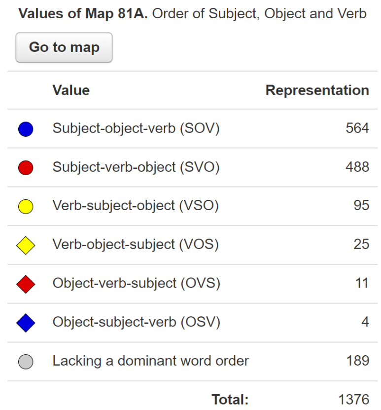 논리적으로 가능한 S, V, O의 순서는 총 6가지이므로 만약 세계 언어의 어순이 완전히 무작위적인 분포를 보였다면 각 어순 유형은 모두 16% 정도, 즉 약 230개씩이 관찰되었어야 했을 것이다. (물론 WALS에서 고른 1376개의 언어 표본이 계통적, 지역적 편향을 모두 제거한 바람직한 표본이라는 전제가 필요하다.)